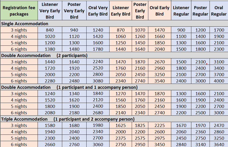 Oral Presentation: - Only Registration Fee: Very Early Bird 600 € - Early Bird 800 € - Regular 1000 € - Onsite 1200 €